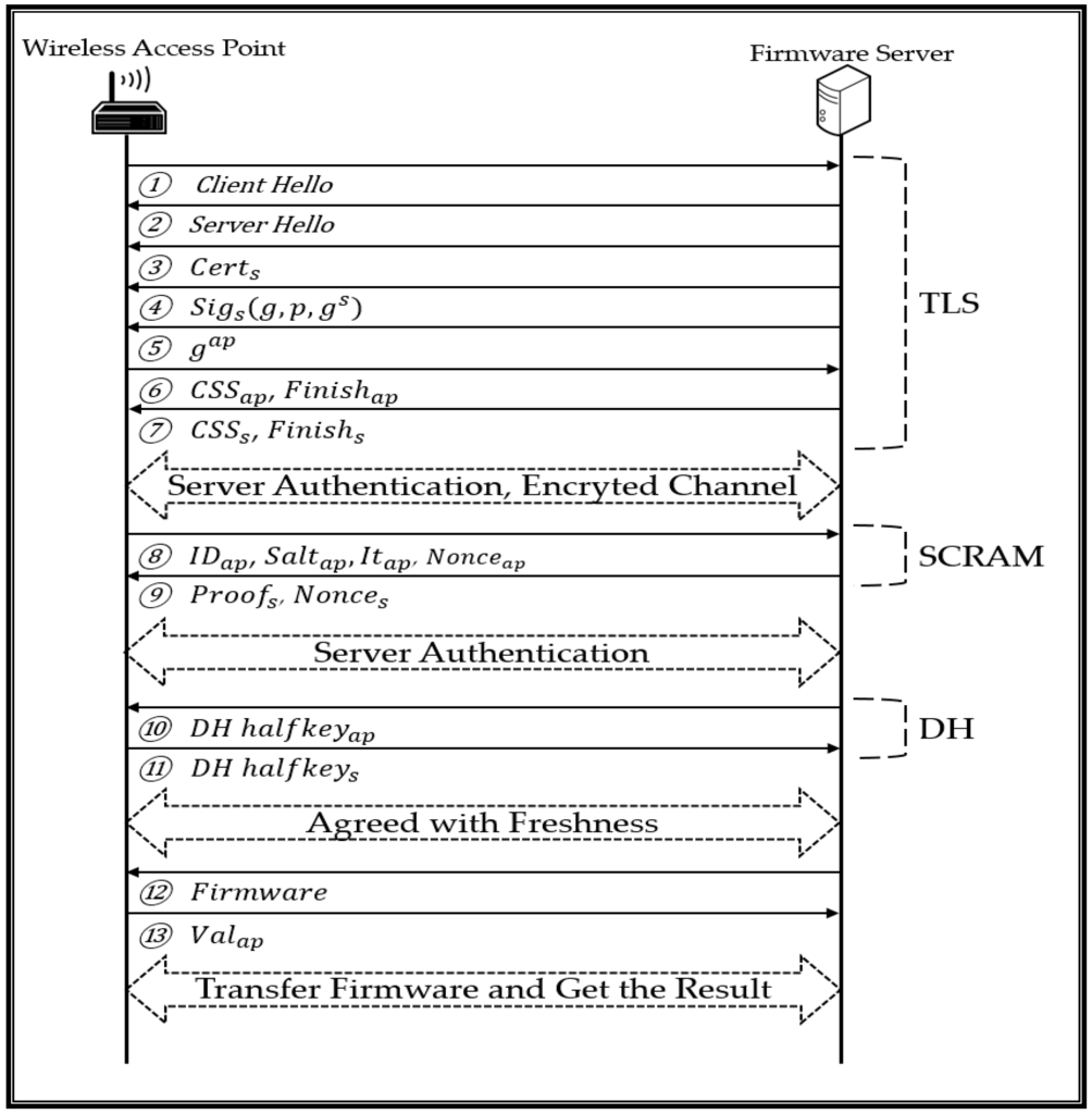 Figure 3 illustrates the protocol of the proposed firmware upgrade, which has four phases. In the first phase, the WAP verifies the firmware server certificate and establishes an encrypted channel using TLS. In the second phase, the WAP authenticates the firmware server using the SCRAM, in which the authentication table information consists of an ID, a password, a secure hash value, the salt, and an iteration count. The authentication in the TLS protocol is based on the certificate, but in the SCRAM, it is based on the password. In the third phase, a key is agreed upon using the anonymous Diffie–Hellman key agreement protocol. The key is used to determine the freshness. The authentication and the encrypted channel of the TLS process protects against MITM attacks [10,11]. In the fourth phase, the firmware server adds the freshness to the firmware and transmits it to the WAP. The WAP compares the freshness of the firmware with its own freshness, which was calculated in the third phase. If the freshness is correct, the WAP upgrades its firmware with the received firmware upgrade.