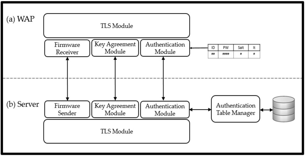 (i) The WAP stores an authentication table that includes the ID, secure hash value, salt, and iteration count of the initial firmware. Furthermore, the password corresponding to the ID is stored in the firmware server authentication table. This information is used for authentication in the SCRAM process to determine whether the firmware server is the correct one.