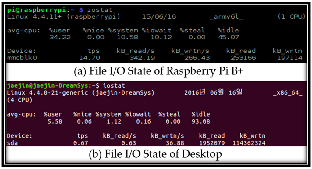 The size of a WAP’s firmware generally varies from 2 MB to 10 MB, as determined from the firmware sizes of the top 10 most popular WAPs of 2015 [30]. We performed 10 tests for each firmware size in a wired connected environment and reported the averages of the upgrade time and resource usage. Table 3 summarizes the results of the experiments. The upgrade time increases in proportion to the size. The other values remain constant regardless of the firmware size. VIRT represents the virtual memory usage, RES represents the shared memory usage, and MEM shows the percentage of consumed memory. Figure 7 compares the desktop PC and Raspberry Pi B+ file I/O waiting for the firmware upgrade. In fact, the difference in the performance of the desktop PC and Raspberry Pi B+ is caused by several different aspects. Hence, they cannot simply be compared. However, we can identify that the file I/O waiting (10.12%) for the Raspberry Pi B+ is much higher than the file I/O waiting (0.16%) for the desktop PC. The Raspberry Pi B+ uses an external microSD card for storage, causing more file I/O waiting than other storage technologies, e.g., an HDD, would incur. Therefore, we can expect that the firmware upgrade time will decrease for a WAP that uses another storage technology.