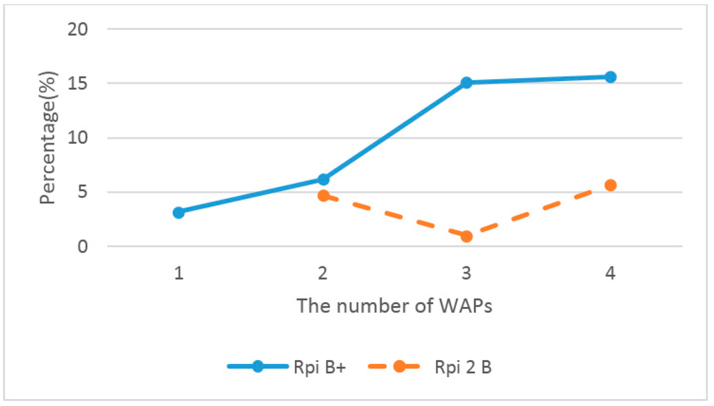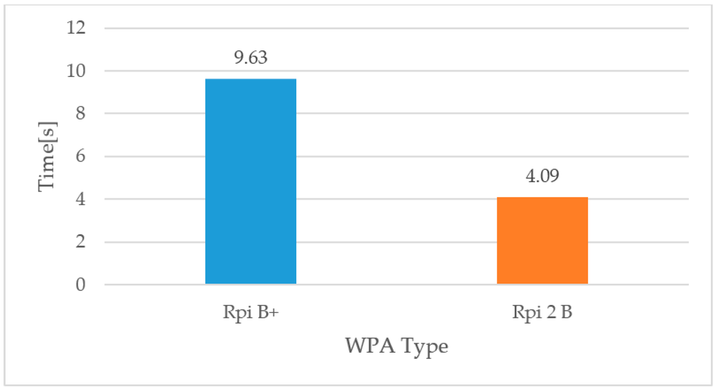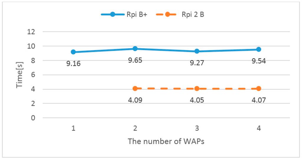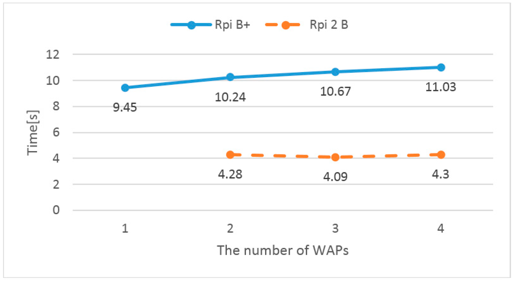 As shown in Figure 8, the upgrade time of the Raspberry Pi 2 B devices are two times faster than Raspberry Pi B+ devices. The firmware size is 2 MB. Figure 9 and Figure 10 show the upgrade times according to the number of WAPs in the wired and wireless connected environments. Basically, there is one Raspberry Pi B+, and Raspberry Pi 2 B devices are used as additional WAPs. In the wired connected environment, the number of WAPs does not affect the firmware upgrade time. However, in the wireless connected environment, the upgrade time of the Raspberry B+ slowly increases according to the number of WAPs. Commonly, wireless communications are severely affected by interference. Thus, the firmware server and WAP cannot perform a firmware upgrade because there is more interference when there are more WAPs.