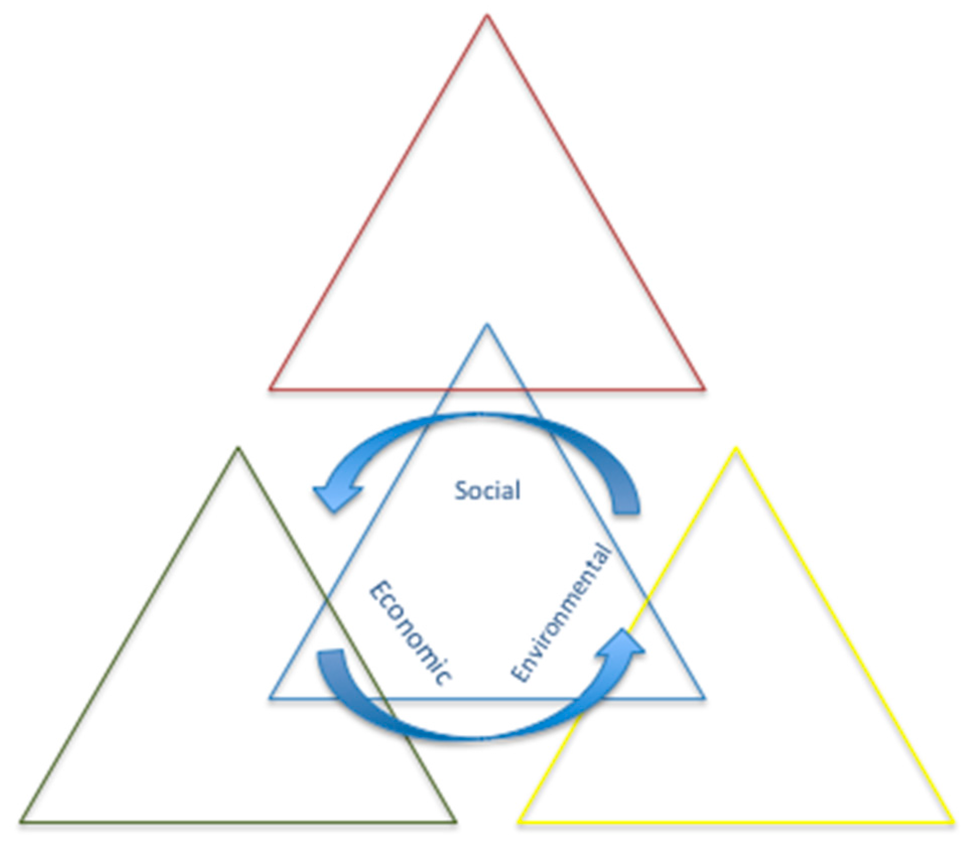 We attempt to diagram this fifth application (Figure 5) of social sustainability by showing how social, economic, and environmental priorities intersect at the level of the individual. Each triangle represents an individual, and triangles intersect (i.e., engage in political dialogue) with one another. Triangles can be understood as what Escobar ([85], p. 6) labels, “historical subjects of particular cultures, economics, and ecologies; particular knowledge producers; individuals and collectives engaged in the play of living in landscapes and with each other in distinctive ways” (p. 6). Sustainability, then, is a process of dialogue and negotiation among these diverse individuals with distinct social, economic, and environmental interests rather than the reconciliation abstract ‘social’ interests with abstract ‘environmental’ and ‘economic’ interests. The practical challenge of this application is collecting and reporting data about sustainability in a consistent, systematic way. The application’s disadvantages are effectively the inverse of the advantages of application #1. Sustainability as an integrated, process-oriented, and place-based concept shares the challenges of solving so-called “wicked problems” [10]: problems that are unprecedented and context-specific, with oppositional problem framings, and solutions that cannot be tested at low-cost. As Rittel and Webber explain, such problems cannot be “solved” in a traditional or scientific (i.e., the traditional scientific method) sense because they are the consequence of diverse and sometimes oppositional perspectives about the nature of the problem. Coping with such challenges and building expertise in emerging fields of knowledge requires new forums for dialogue, and a willingness to reexamine to role of science in policy making (see also [2]).