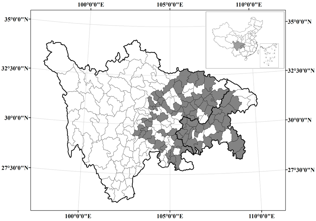 Geographic locations of 543 on-farm experimental sites during the 2005–2009 rice seasons in 76 counties (the grey areas) of the Sichuan Basin, China.