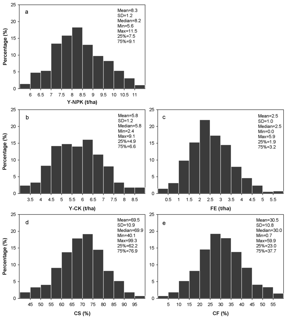Frequency distribution of rice yield with (a) NPK fertilizers (Y-NPK) and without (b) NPK fertilizers (Y-CK), (c) fertilization effect (FE), and (d) contribution of Y-CK (CS) and (e) contribution of fertilizer (CF) to Y-NPK.