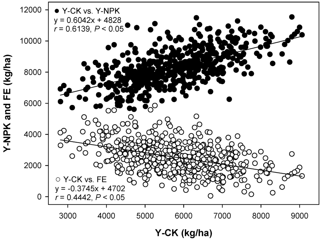 As shown in Figure 3, Y-CK was positively correlated to Y-NPK (r = 0.61, p < 0.05), but negatively to FE (r = −0.44, p < 0.05), indicating that high rice yield under fertilizer application but low fertilization effect were likely to be obtained in fields with high inherent soil productivity.