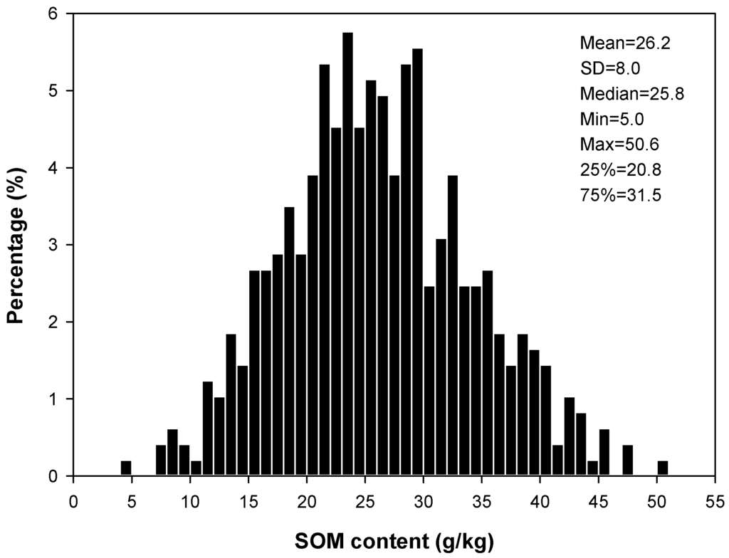 Frequency distribution of soil organic matter (SOM) content in plough layer (0–20 cm) of experimental fields.