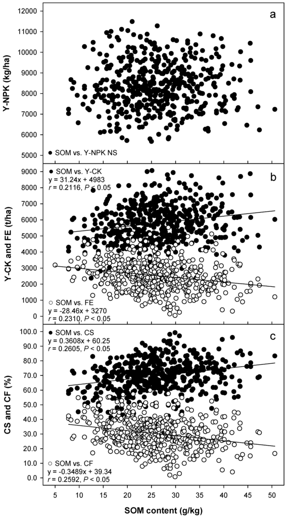 3.2. Relationships between SOM and Y-NPK, Y-CK or FE