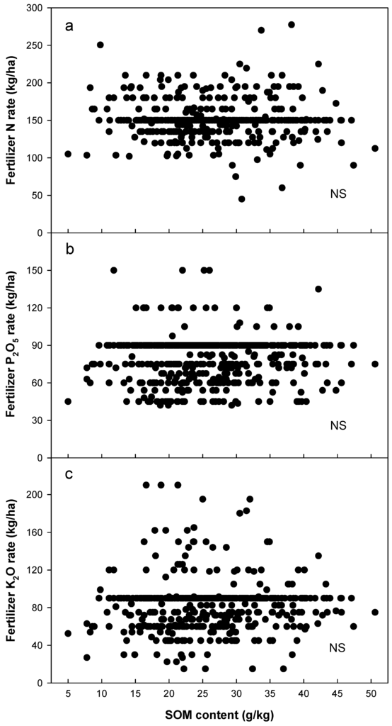 Relationships between SOM content and nitrogen (N), phosphorus (P), and potassium (K) fertilizer rates. (a) Fertilizer N rate (kg/ha); (b) Fertilizer P2O5 rate (kg/ha) and (c) Fertilizer K2O rate (kg/ha).