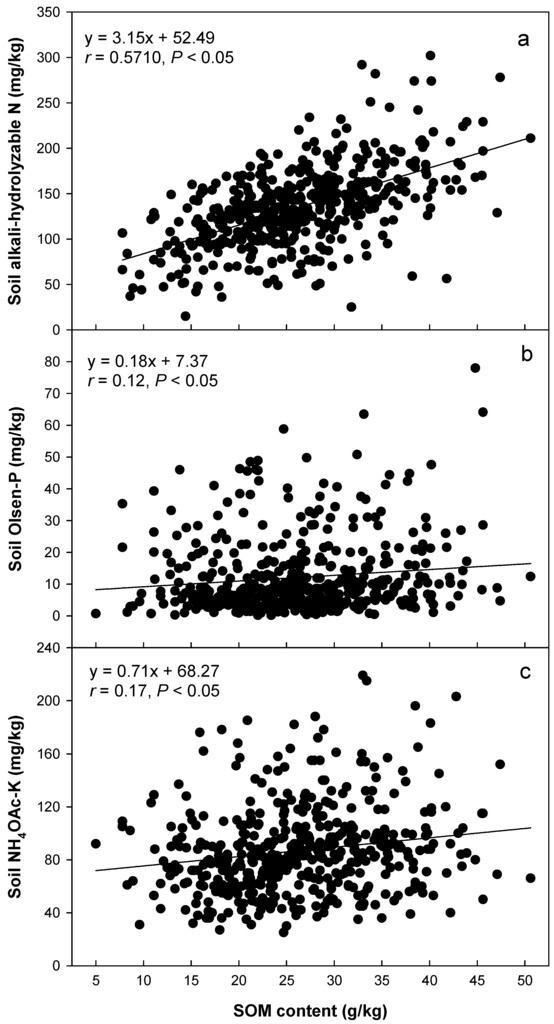 Relationships between SOM content and soil alkali-hydrolyzable N, Olsen-P or NH4OAc-K. (a) Soil alkali-hydrolyzable N (mg/kg); (b) Soil Olsen-P (mg/kg) and (c) Soil NH4OAc-K (mg/kg).