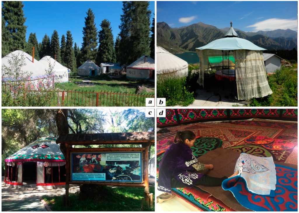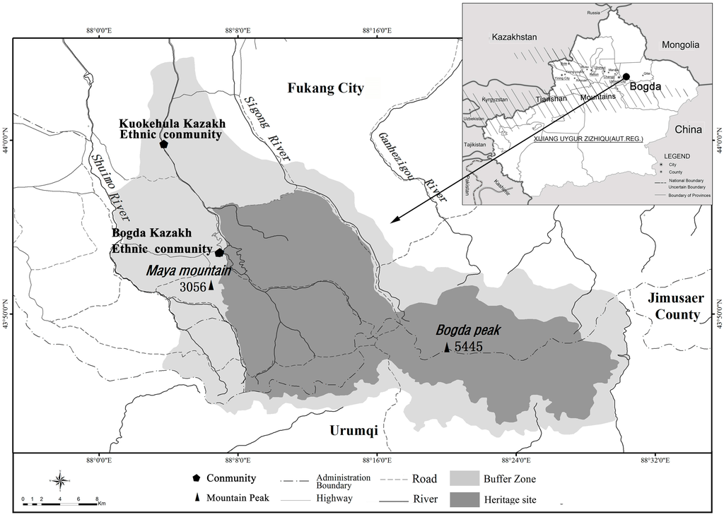 Since the implementation of the grazing ban at the Bogda heritage site, the livelihoods of the pastoralists have changed, shifting from nomadism to engagement in tourism. The formerly nomadic people were settled in two sedentary communities, the Bogda Kazakh ethnic community and the Kuokehula Kazakh ethnic community, which in the buffer zone of Bogda heritage site (Figure 2). Local people of the two communities main operations are song and dance performances, managing the displays at arts and crafts events, sales of souvenirs and characteristic ethnic foods and beverages.
