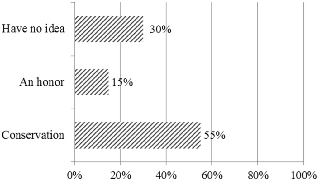During the Bogda World Natural Heritage nomination process, the administrators carried out numerous publicity activities among the residents for heritage conservation. Therefore, more than half (55%) of the respondents claim to understand that World Natural Heritage must be strictly protected (Figure 3), and 15% of the respondents are aware that World Natural Heritage status is a kind of honor and brand, and this makes them proud of where they live. However, approaching a third (30%) of respondents lack a clear understanding of what World Natural Heritage really means.