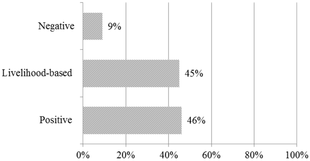 The protection of the Bogda heritage site is ultimately inseparable from the lifestyles and involvement of local residents and a strong relationship exists between the interests of the community residents and heritage conservation. They and their ancestors have been sustained by the Bogda environment for generations. In the survey, 46% of respondents show a positive attitude towards participation in the conservation of the Bogda heritage site. Furthermore, essentially the same proportion (45%) of respondents asserted that they are willing to participate in heritage conservation under the premise that their normal life will not be affected. Only a minority (9%) claimed that they wish to have nothing to do with the heritage conservation (Figure 5).