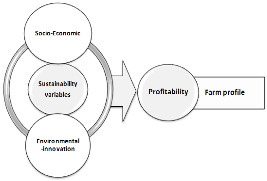The objective of this paper is to provide evidence of relationships between profit and sustainability. Although said relationships can be understood in both senses, this initial approach is focused on the socio-economic factors, and also those associated with family farms’ environmental innovation, which may have an impact on profitability (see Figure 1). To this end, our empirical analysis is based on the agrarian system in Almería, a province in Southeast Spain, characterized by a structure consisting of small-scale family farms, and which has experienced an unprecedented transformation in the last 50 years. The main aim is not only to consider whether the profit of a family farm is compatible with sustainability from a holistic approach, but also to investigate how they are related.