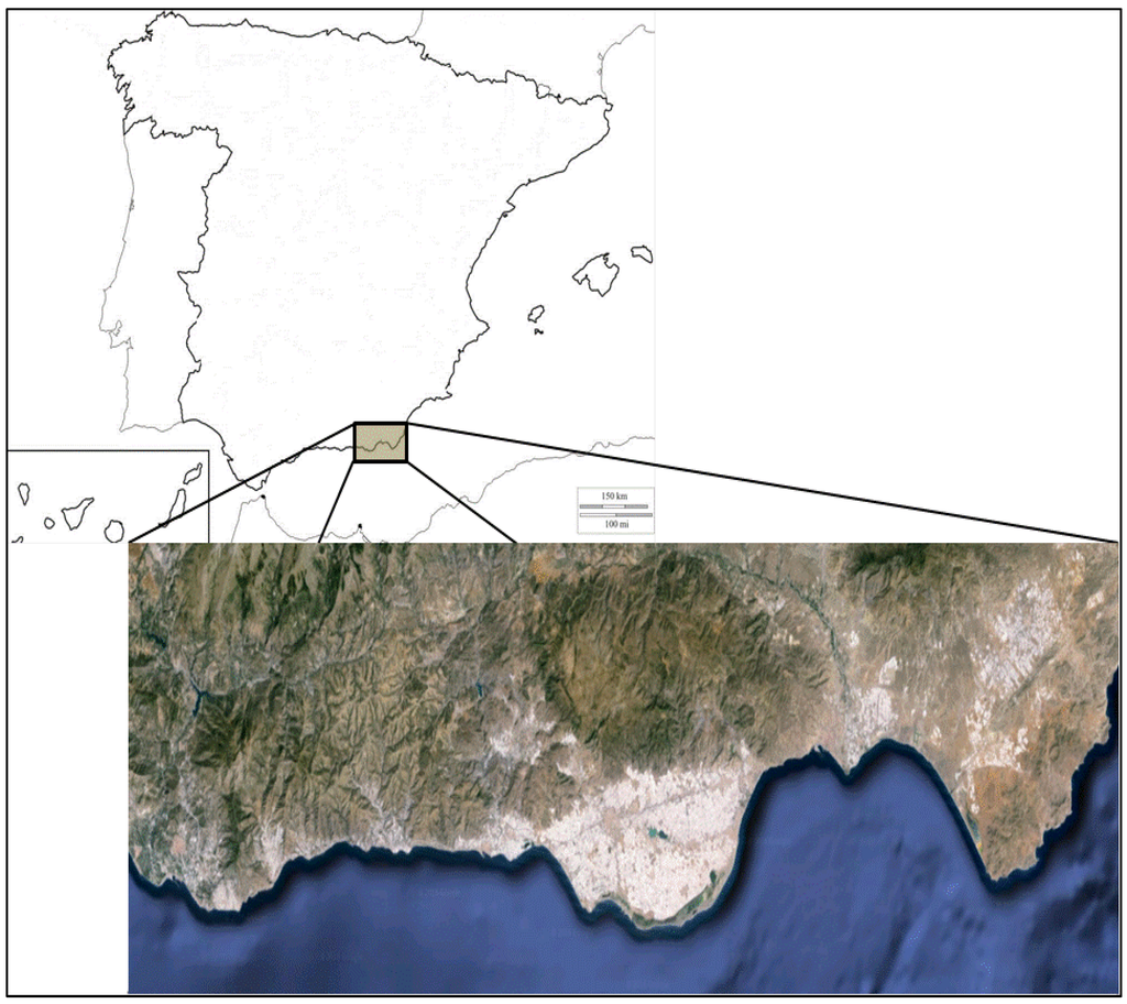We take family farms in Southeast Spain, particularly in the coastal areas of the provinces of Almería, and partly Granada (see Figure 2), as our reference case. This unique model is the most important driver of the enormous socioeconomic development the area has undergone in the last five decades, due to the hugely successful agricultural activity and tremendous effort on the part of family farms. Farming represents 27% of employment and 24% of GDP (gross domestic product) in this region [25].