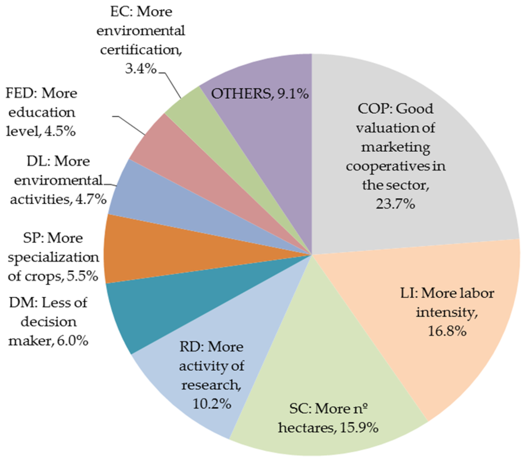 In terms of the second block of variables, family farms’ profitability increases as they have better environmental performance. Specifically, results show that organic production and integrated pest management and other environmental certifications have a significant and positive impact on profitability. Family farm environmental awareness also has a strong influence, especially if it is considered relevant by other family farms and cooperatives in the sector. Finally, innovation aspects also improve profitability. If a family farm works proactively with research centers and universities on innovations and then implants agroecological improvements and technology, a family farm can lower labor intensity and increase profitability.