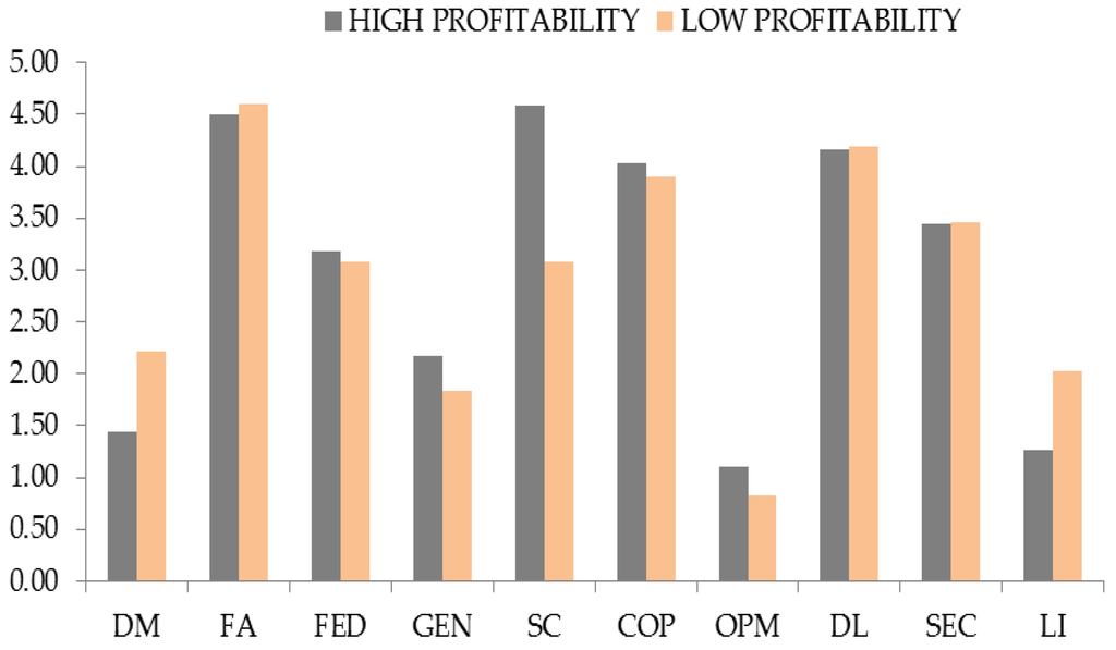 This analysis coincides when the average values of the variables utilized are analyzed by distinguishing the farms with the highest and lowest profit (Figure 5).