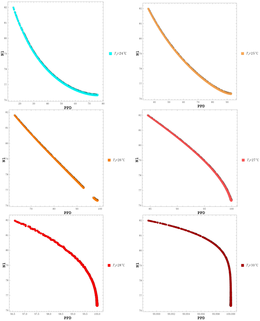 For this parameter, a Pareto frontier is obtained but the shape of the frontier does not evince any singularly optimal values. Instead, there is a linear trade-off between N2 and PPD, with lower temperatures clearly favored for a lower PPD. The temperature dependence was also analyzed in this case (Figure 7). No solutions exist for temperatures higher than 30 °C, and there is 100% dissatisfaction even at 28 °C, a very typical summer temperature for Ancona.