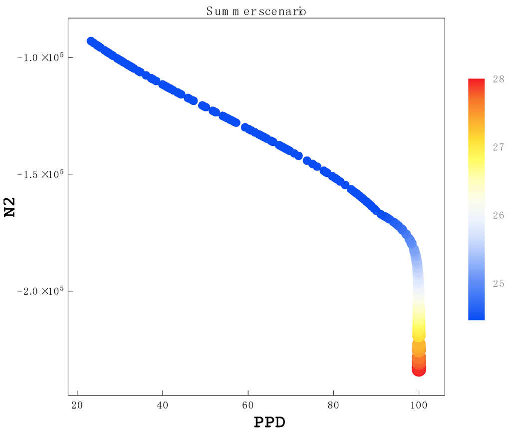 Pareto frontier of solution clusters for the summer scenario. The N2 parameter is on the y-axis and PPD is on the x-axis.