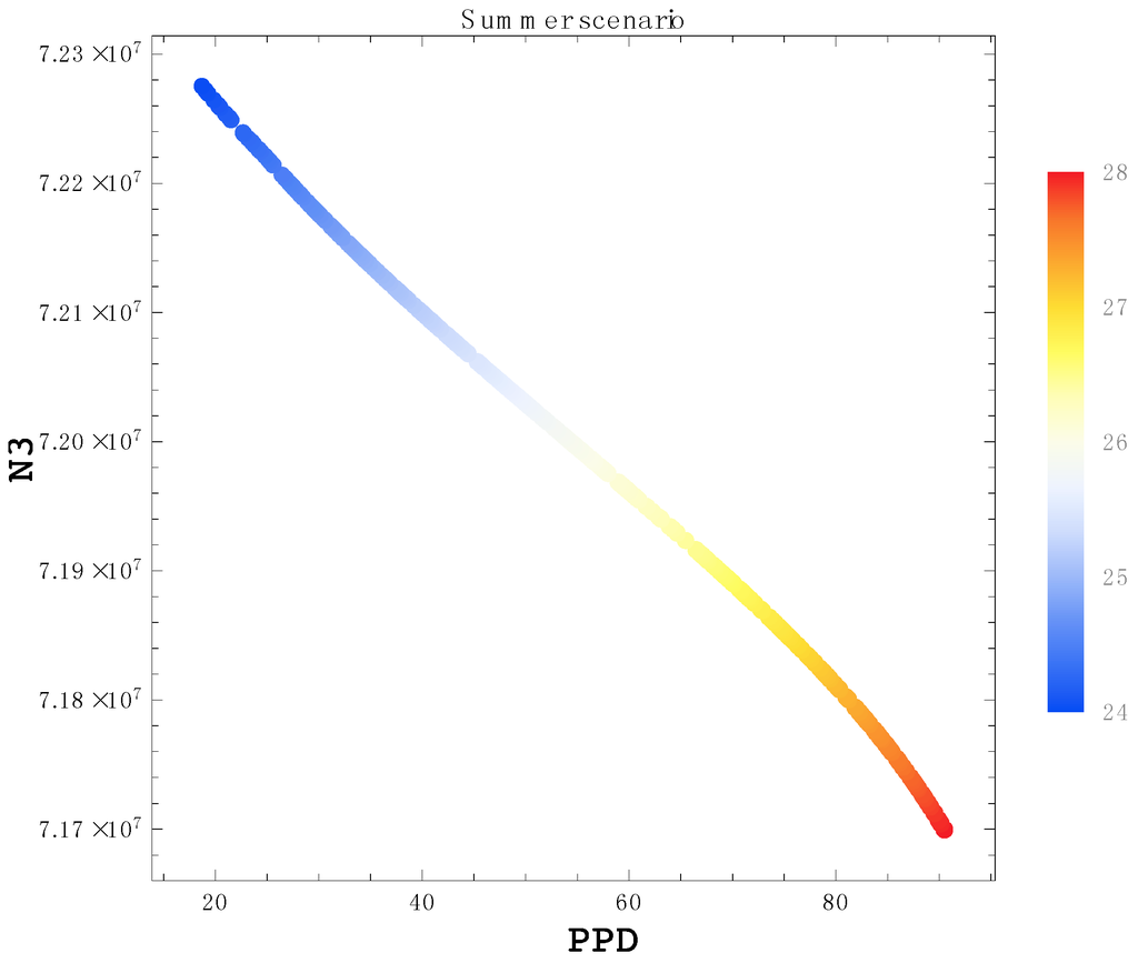 Pareto frontier of solution clusters for the summer scenario. The N3 parameter is on the y-axis and PPD is on the x-axis.