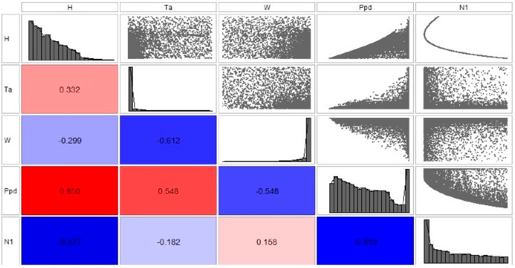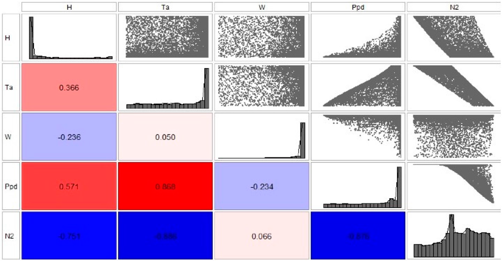 Some interesting correlations can be seen in these plots. As expected and as illustrated in Figure 9, temperature has a minor effect on parameter N1, with a correlation value of 0.110. Figure 11 instead shows that there is a much stronger correlation of temperature with N3, with a value of 1.00. N2 also correlates highly with temperature. This is also confirmed by the scatter plots corresponding to temperature vs. N1, N2, and N3 shown in Figure 9, Figure 10 and Figure 11, respectively. Figure 10 and Figure 11 also reiterate the high correlation of temperature with PPD. One further interesting aspect is the relatively high correlation of building height with PPD as shown in Figure 9 and Figure 10, which also appears in Figure 11 to a lesser degree. This is certainly an aspect that deserves further investigation.