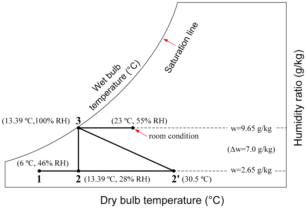 Figure 2 shows the psychrometric processes of both humidifying a cleanroom by steam and mist humidification.