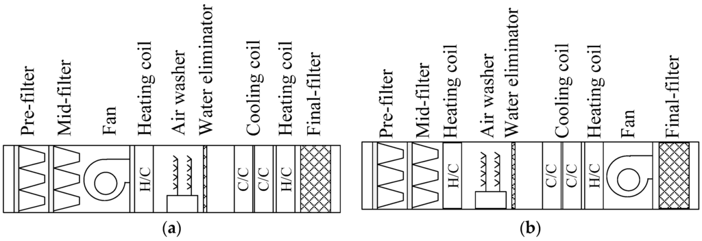 Depending on the location of the fan relative to the cooling coils (upstream or downstream), a MAU can be categorized as a push-through type MAU (