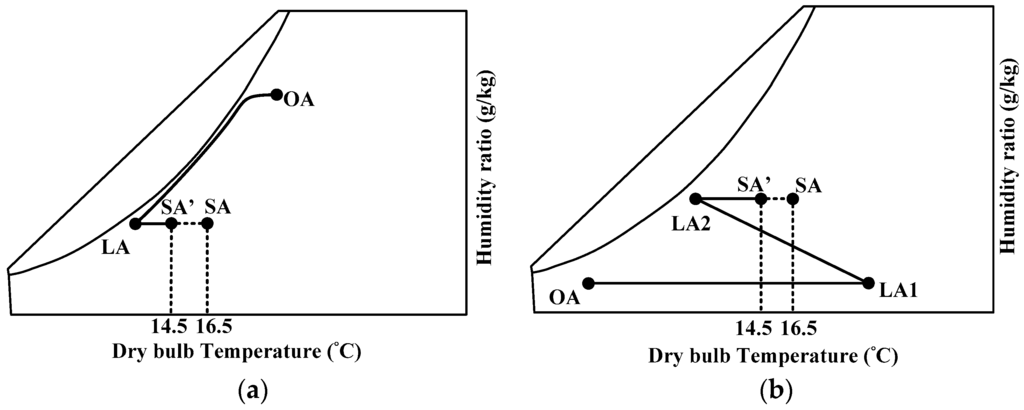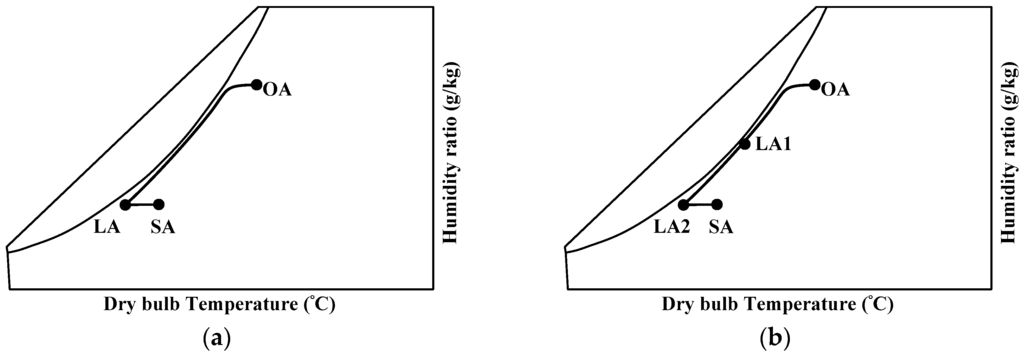 2]. As the relative humidity required for industrial cleanroom is low, the designed humidity ratio is lower than the HVAC system used in commercial buildings. Thus, the supply water temperature for the cooling coil inside the MAU is typically 5–7 °C. This low temperature of the supply water reduces water chiller’s efficiency. In general, a rise of 1 °C in evaporator temperature of water chiller can increase chiller efficiency by about 3%. Therefore, by dividing one cooling coil with low supply water temperature into two cooling coils with different supply water temperatures (i.e., 9 °C for first cooling coil and 6 °C for second cooling coil), total energy consumption of water chillers can be reduced [