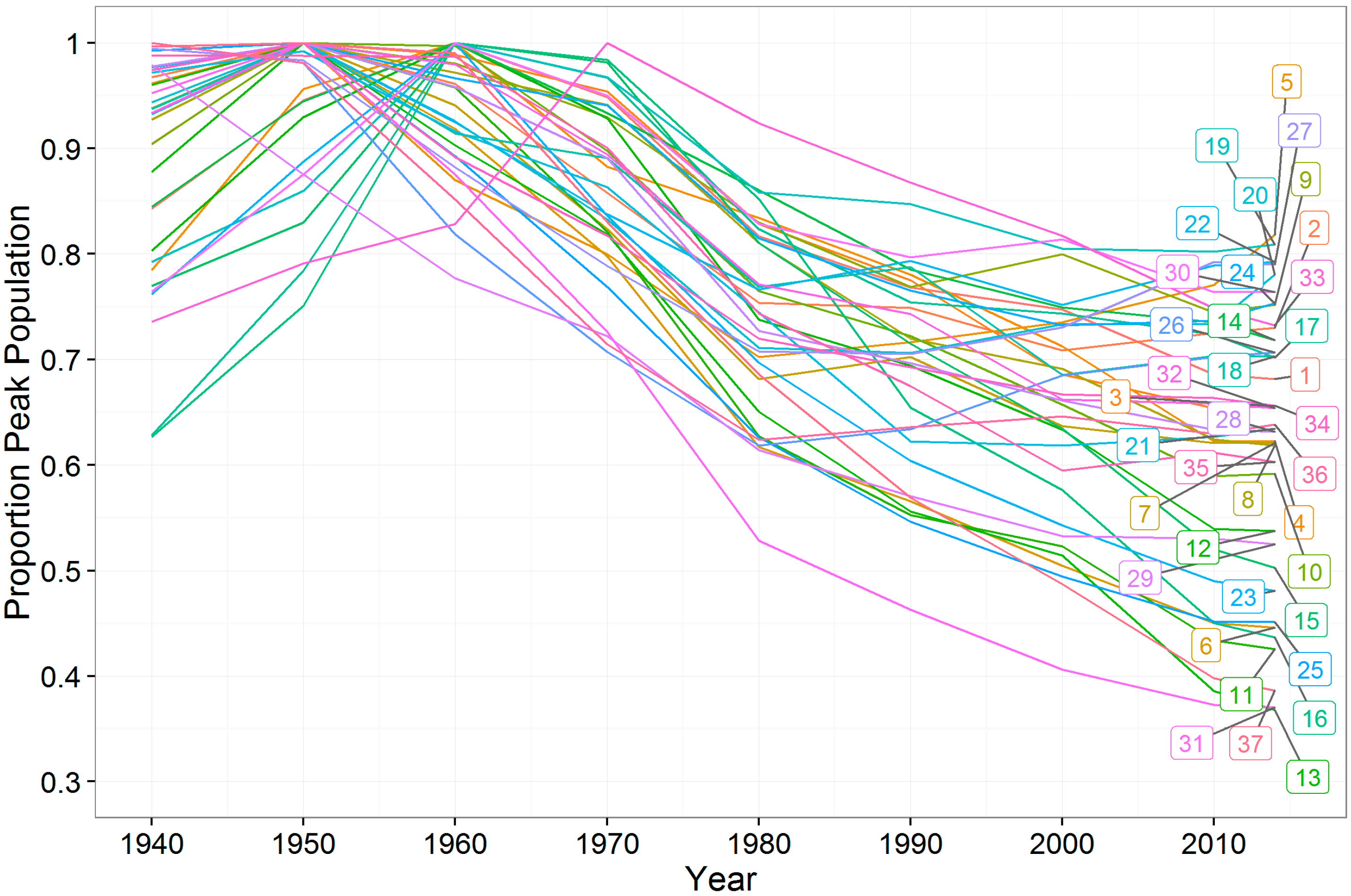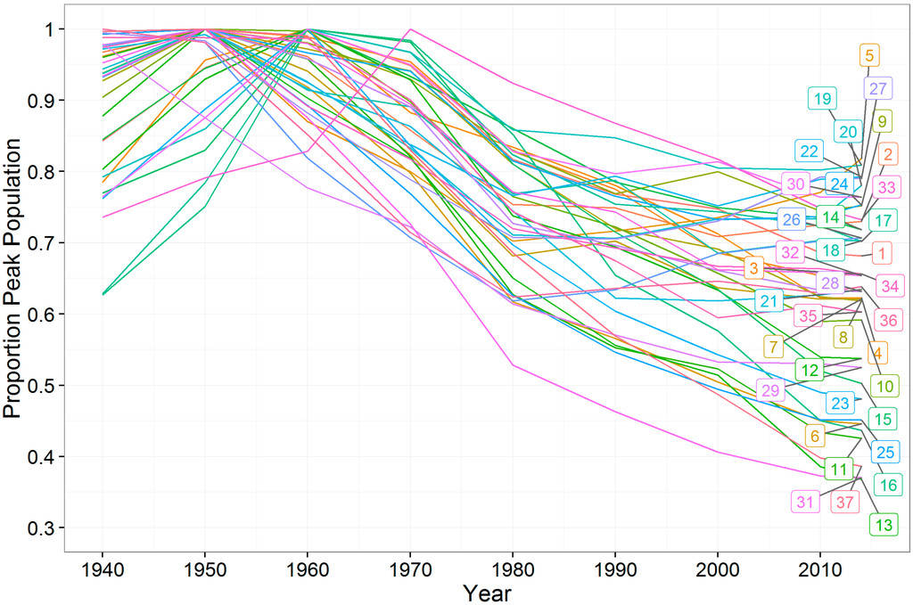 Population levels from 1940–2014 for U.S. shrinking cities as a proportion of their peak population, for cities of greater than 100,000 people at their peak population level. 1—Akron, OH; 2—Albany, NY; 3—Baltimore, MD; 4—Birmingham, AL; 5—Boston, MA; 6—Buffalo, NY; 7—Camden, NJ; 8—Canton, OH; 9—Chicago, IL; 10—Cincinnati, OH; 11—Cleveland, OH; 12—Dayton, OH; 13—Detroit, MI; 14—Erie, PA; 15—Flint, MI; 16—Gary, IN; 17—Hammond, IN; 18—Hartford, CT; 19—Milwaukee, WI; 20—Minneapolis, MN; 21—Newark, NJ; 22—New Haven, CT; 23—Niagara Falls, NY; 24—Philadelphia, PA; 25—Pittsburgh, PA; 26—Providence, RI; 27—Reading, PA; 28—Rochester, NY; 29—Scranton, PA; 30—South Bend, IN; 31—St. Louis, MO; 32—Syracuse, NY; 33—Toledo, OH; 34—Trenton, NJ; 35—Utica, NY; 36—Wilmington, DE; 37—Youngstown, OH.