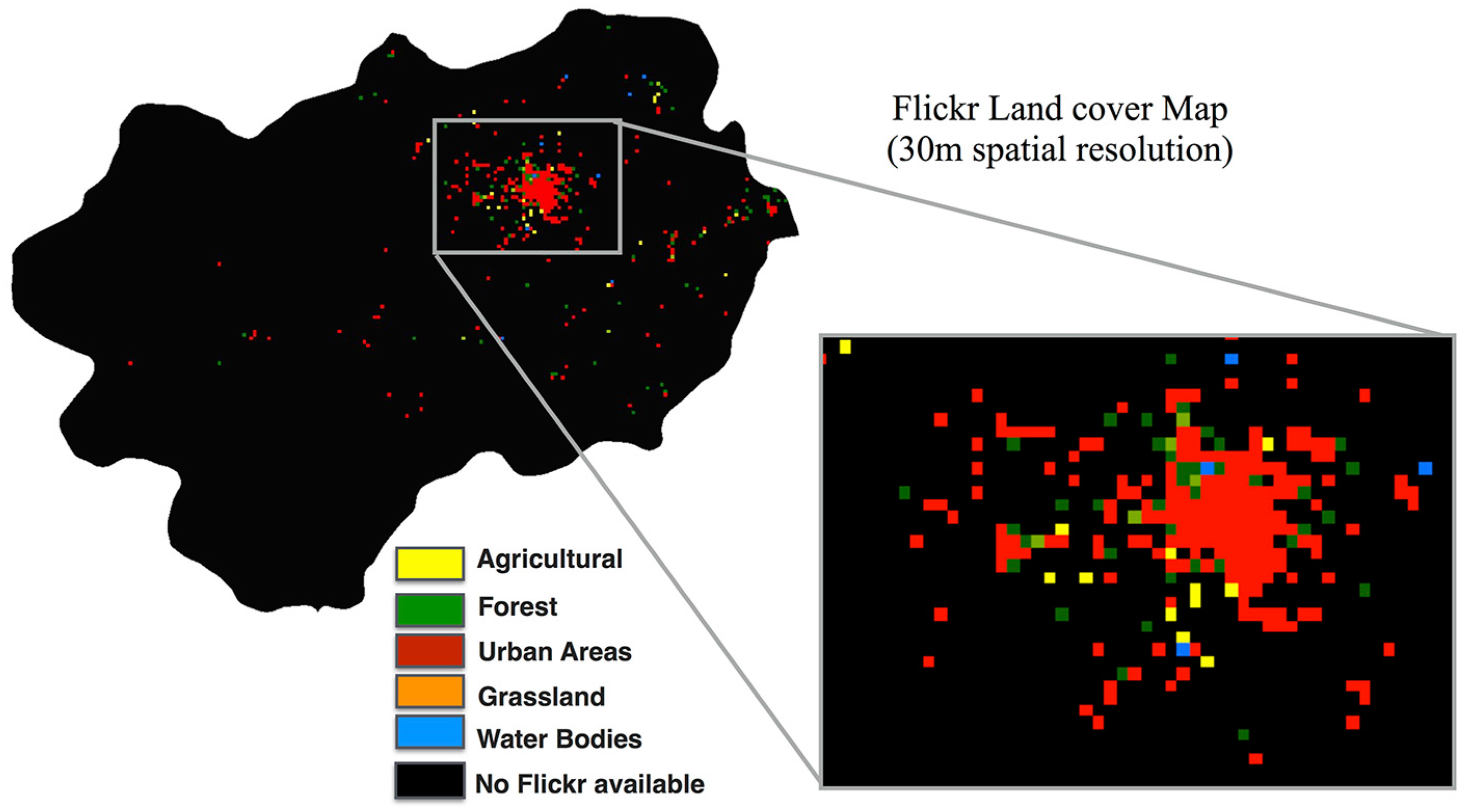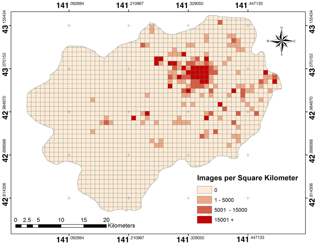 Figure 15 shows the LULC map obtained from Flickr imagery. It contains the majority LULC class for the area in Sapporo City, Japan. The Flickr LULC map occupies approximately 10% of the total area, whereas other areas have no Flickr images. However, the urban areas have the highest distribution of the crowdsourced LULC map. This agreement could be due to the density and distribution of available images being sufficiently high in a particular tile [