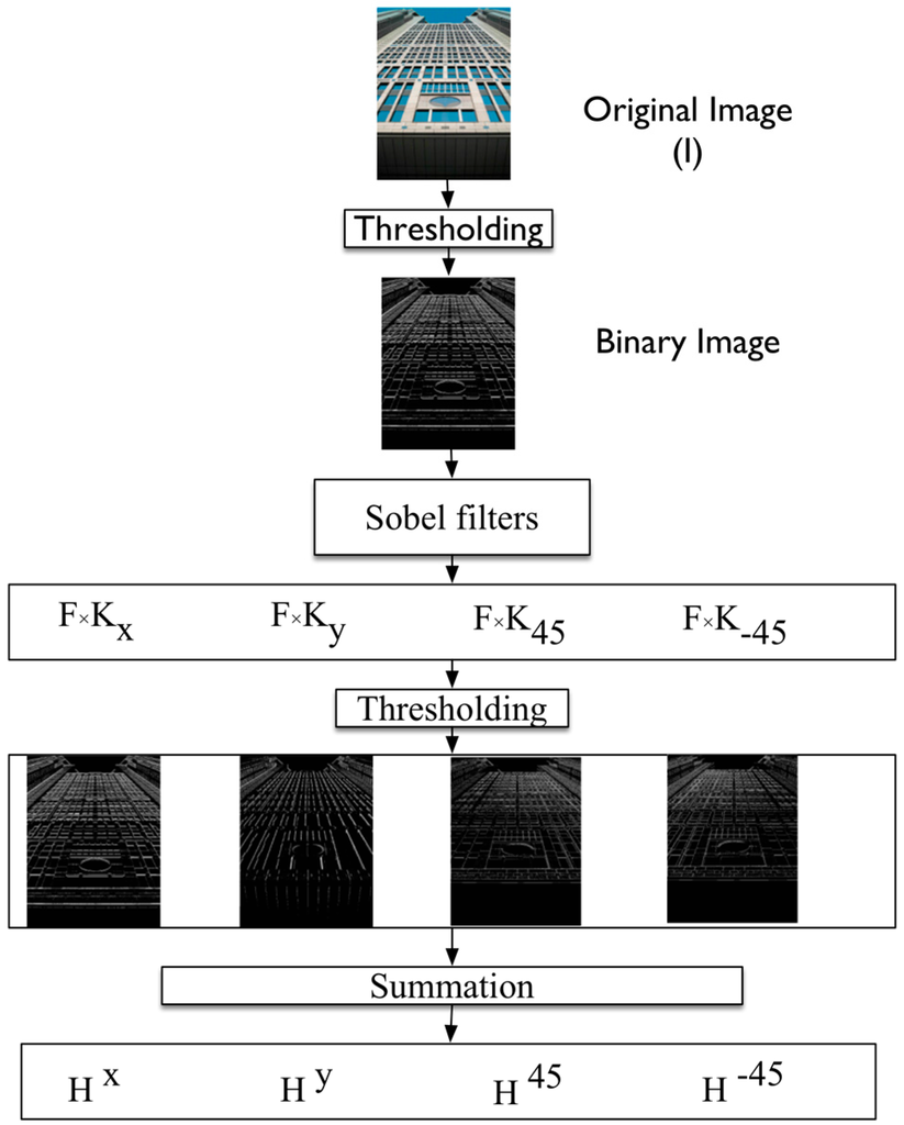 Figure 4 for a schematic of our edge orientation histogram extraction approach. We use F, the binary result of Otsu segmentation from the previous step. We apply four 3 × 3 Sobel edge kernels, which are tuned to detect edges in the horizontal (