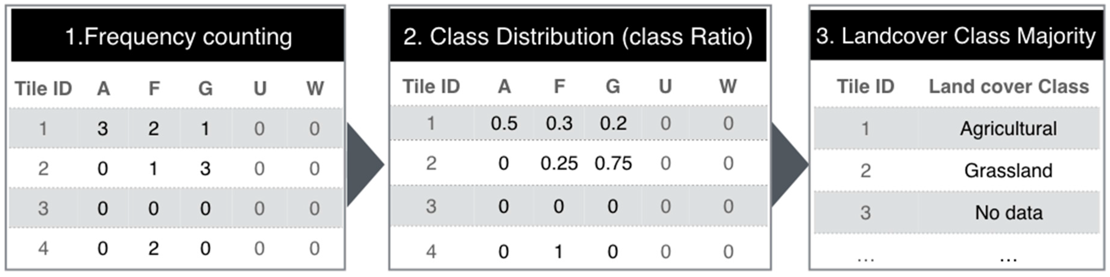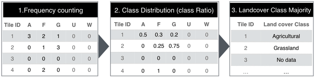 Section 2.2) tiles and mapped each labeled Flickr image to a tile. To label the LULC class of each tile, the neighboring images were considered for majority class filtering by selecting the highest frequency LULC class in the given tile.