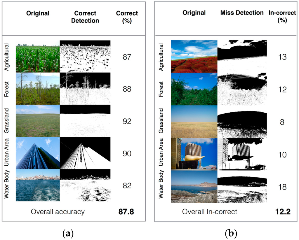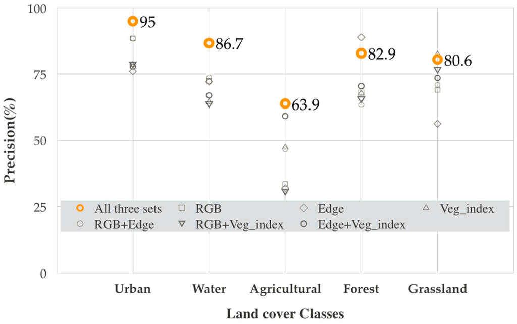 Figure 13 shows the system performance with different combinations of color, edge, and VI features. The combination of multiple features contributed to the discrimination between different LULC types. The urban area, water, forest, and grassland categories are classified with satisfactory accuracy (>80%). However, agricultural shows only 63.9% positive classification, primarily because of the misclassification of agricultural areas as other classes (36.1%). This misclassification may result from the relatively small number of training samples in the dataset and heterogeneity features in the agriculture images.