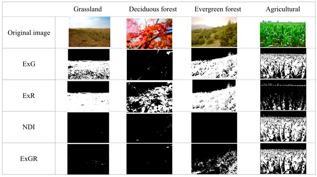 Section 3.1.2. We found that the ExG index successfully discriminated grassland, evergreen forest, and agriculture from the background; however, it separated deciduous forests with higher redness from other forests. ExR was useful for discriminating grassland from the background on account of its extraction of redness, soil, and residue. It was also effective at separating deciduous forests and evergreen forests. Nevertheless, it did not perform well for extracting dominant greenness (agriculture).
