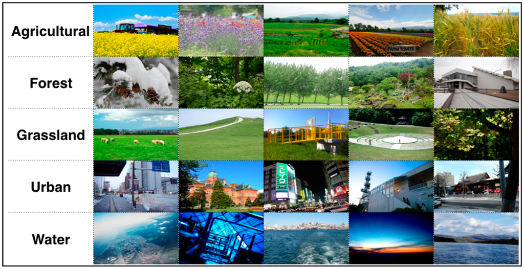 The segmentation method extracts relatively homogeneous regions. Based on the segmentation results, we removed the background from each image and calculated the feature images for further analysis. Manually selected training sample images were placed into the categories of agriculture, forest, water, grassland, and urban. Sample color feature histograms are shown in