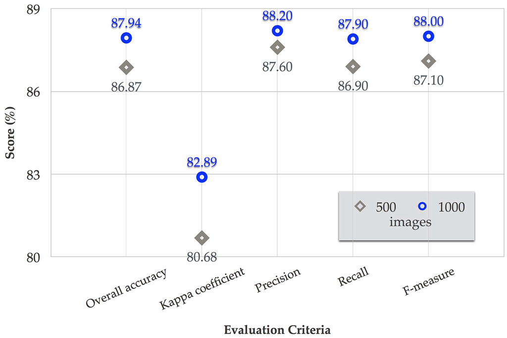 Figure 12 shows that at least 1000 training image samples are required for naive Bayes to provide a satisfactory LULC class estimation. The performance obtained using 1000 training samples are clearly better than the results with 500 training samples. With 1000 training samples, we obtained an overall accuracy, kappa coefficient, precision, recall, and f-measure of 87.94%, 82.89%, 88.20%, 87.90%, and 88%, respectively.