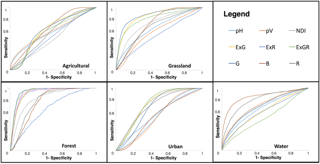 For each LULC class, we compared correctly classified relevant images against incorrectly classified images. In the case of water, the ROC curve and area under the ROC curve for the blue descriptor performed well. The green descriptor showed outstanding performance (ExGR: 0.944 and G: 0.943) in discriminating grassland and forest from other classes, as shown in