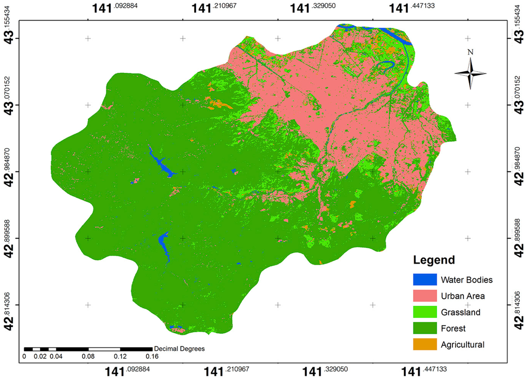 Figure 16 shows the Landsat TM5 based LULC mapping, which was trained by Flickr images. The accuracy evaluation was performed to compare the accuracy between the crowdsourced and Landsat TM5 LULC mapping coverage of the Sapporo City area.