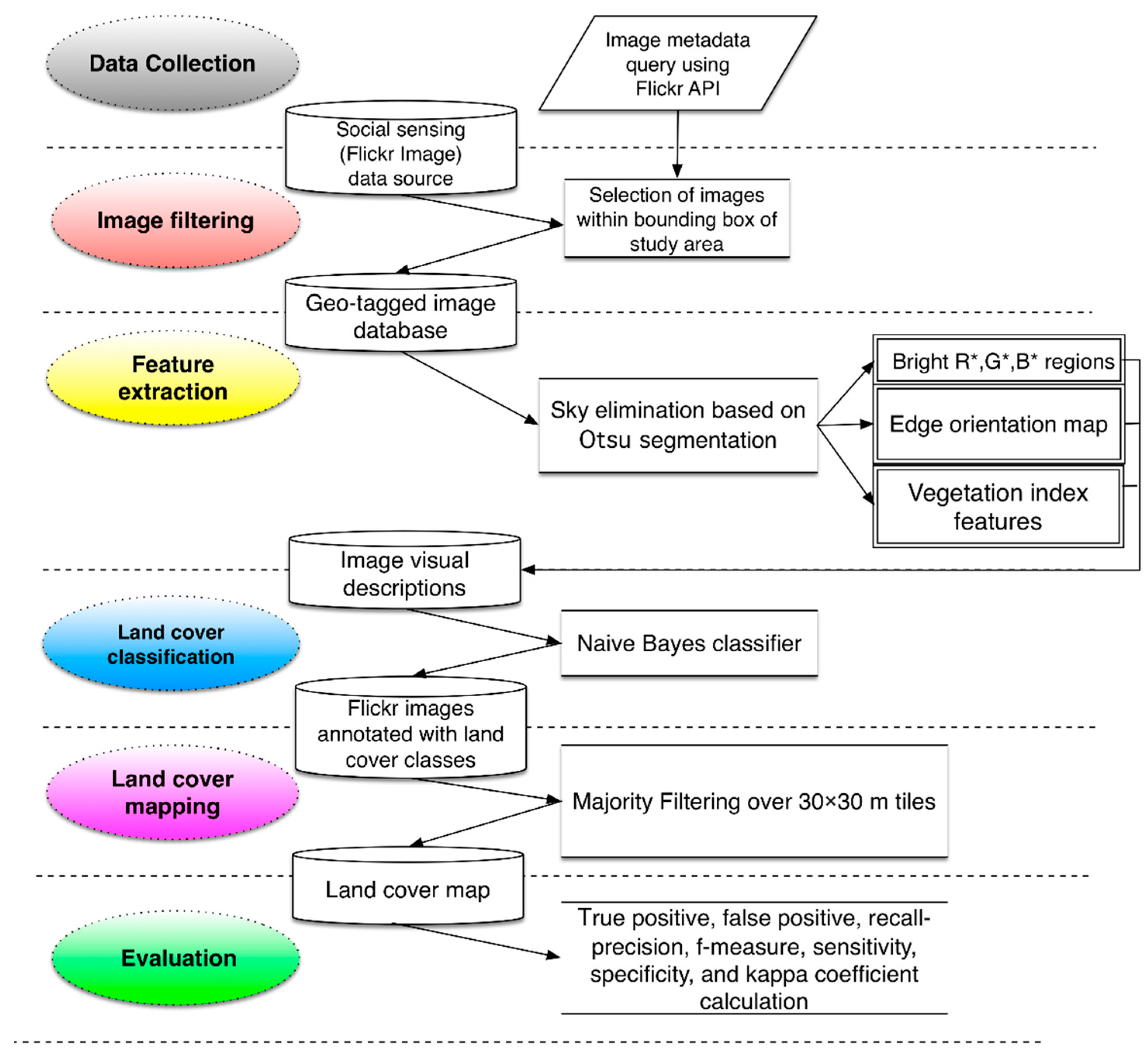 In short, the proposed approach uses the crowdsourced (Flickr images) dataset and produces training and validation data for use in various LULC applications. However, the performance of the image processing chain may be limited, particularly over a large area and by variety of classes requiring a sufficient quality of reference data.