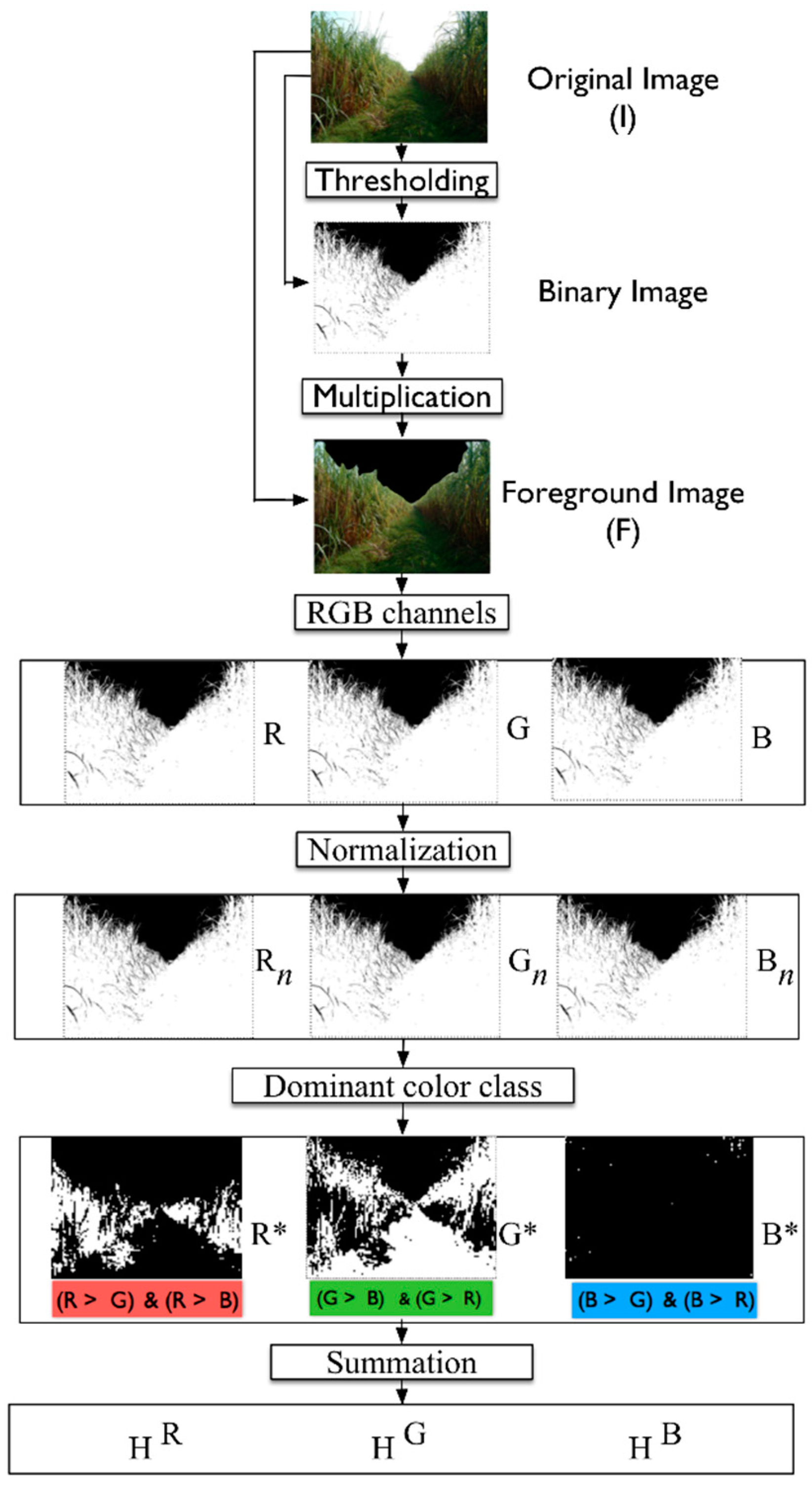 Figure 3 for a diagram that summarizes our image segmentation and RGB feature extraction approach. We assume that the input is a three-channel RGB image with possible sky regions segmented as background. It is assumed that the remaining pixels are foreground. Because color is more important than intensity, we normalize the RGB image, as follows, to reduce dependency on the illumination conditions (Equation (2)) [