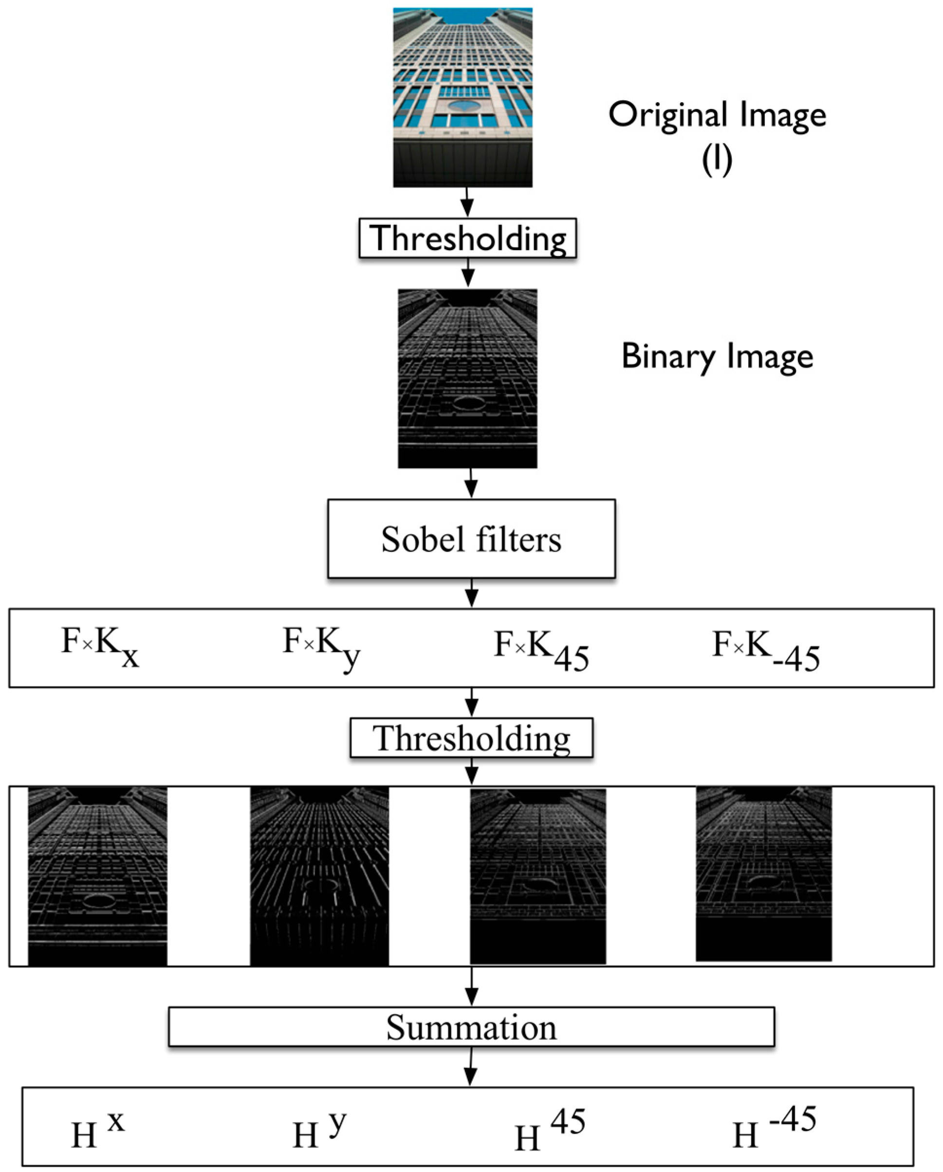 −45 of these filters to convert each edge magnitude image into a binary image. We classify each pixel with a gradient magnitude above the threshold as a possible horizontal, vertical, diagonal up, or diagonal down edge. The binary-oriented edge images are then summed, yielding four features (H