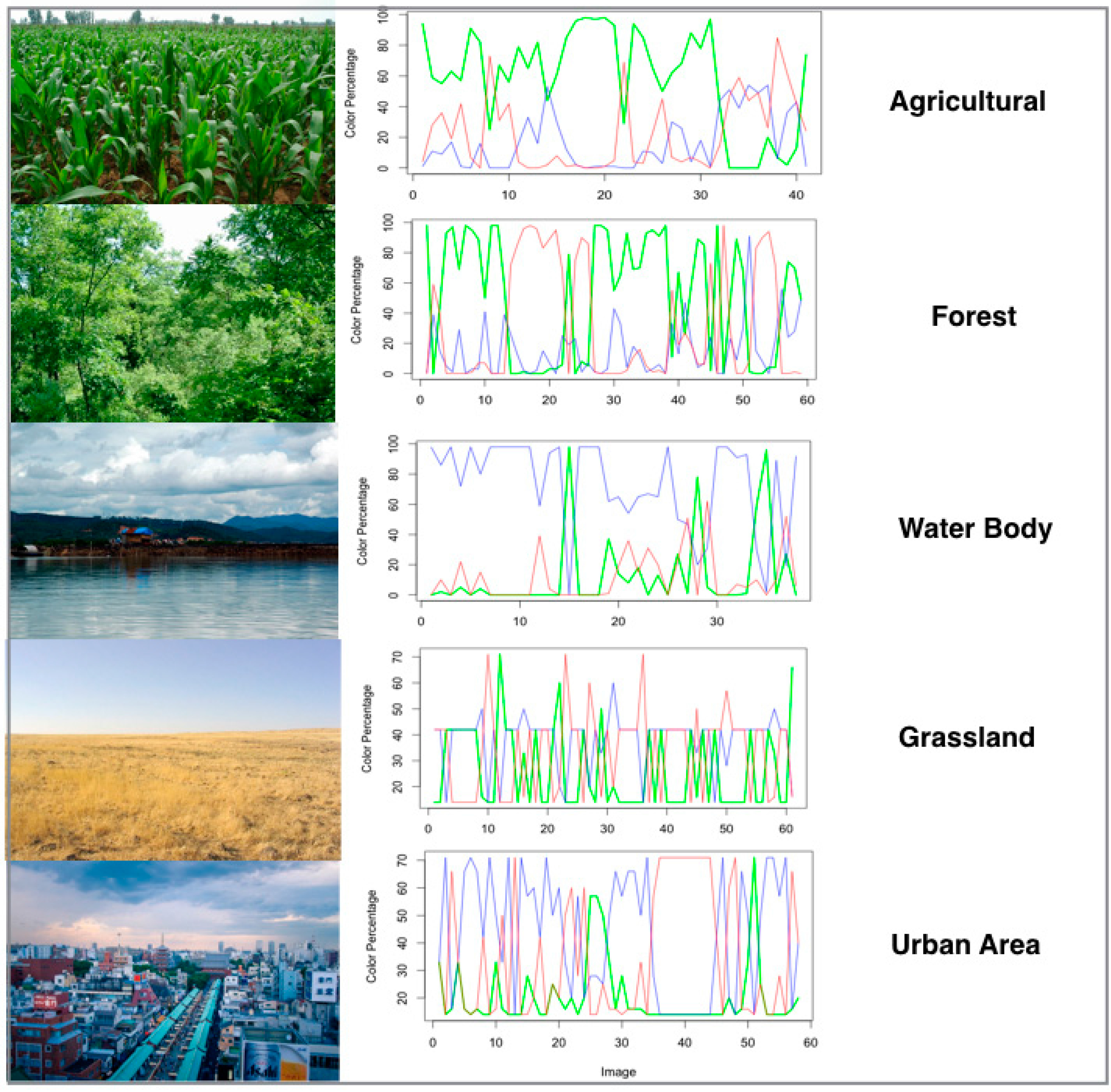 Figure 8. Classes with vegetation (agriculture, and forest) show a dominant green channel, while the water class shows a dominant blue channel. However, grassland and urban areas have no distinctive color channel patterns. This is possibly on account of the variation in color of the targeted feature.