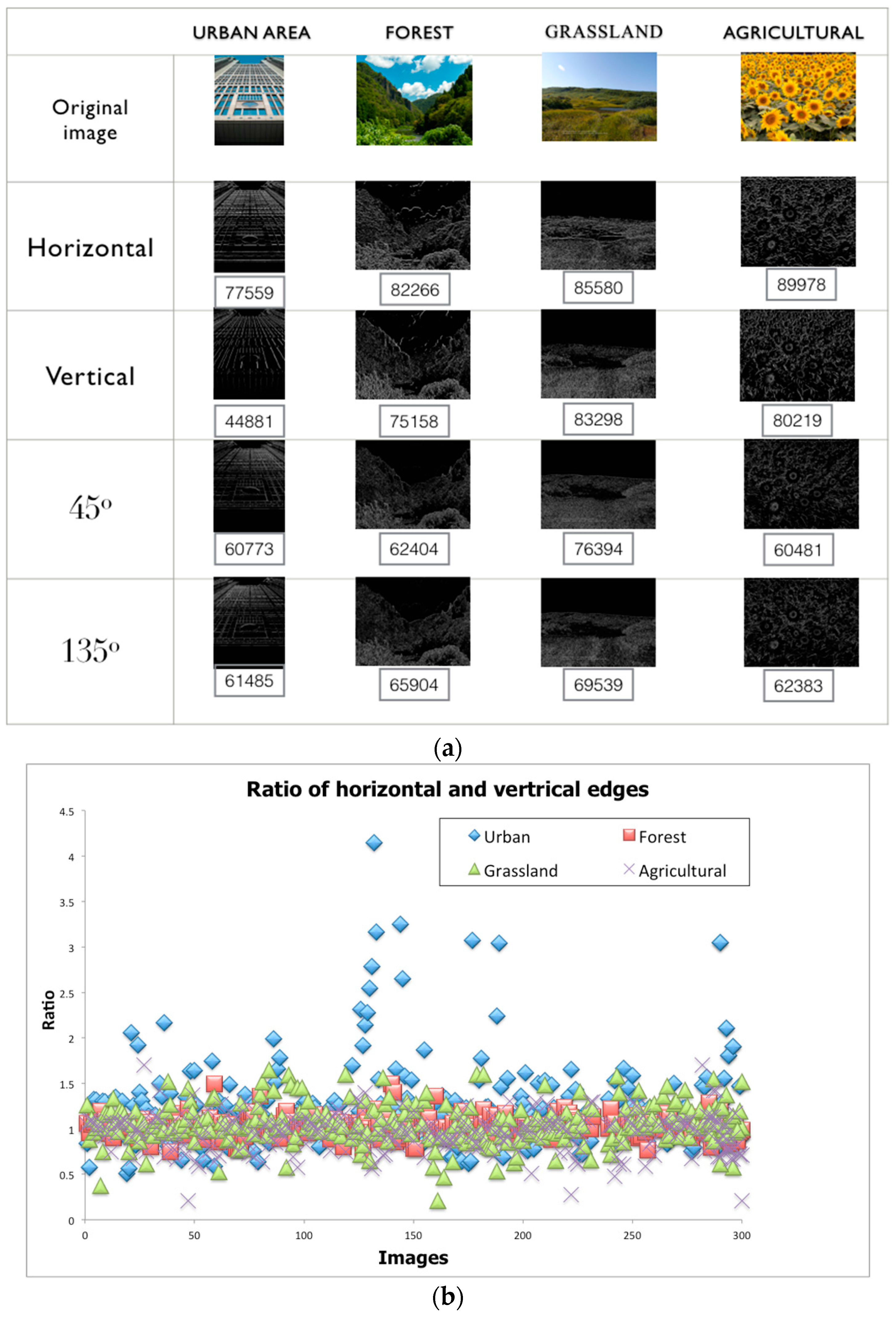 Figure 9a. We found that images of urban scenes have a much higher proportion of horizontal and vertical edges than other non-urban scenes (forest, grassland, and agriculture). Developed areas show a visible pattern (spikes in the ratio of horizontal and vertical edges in