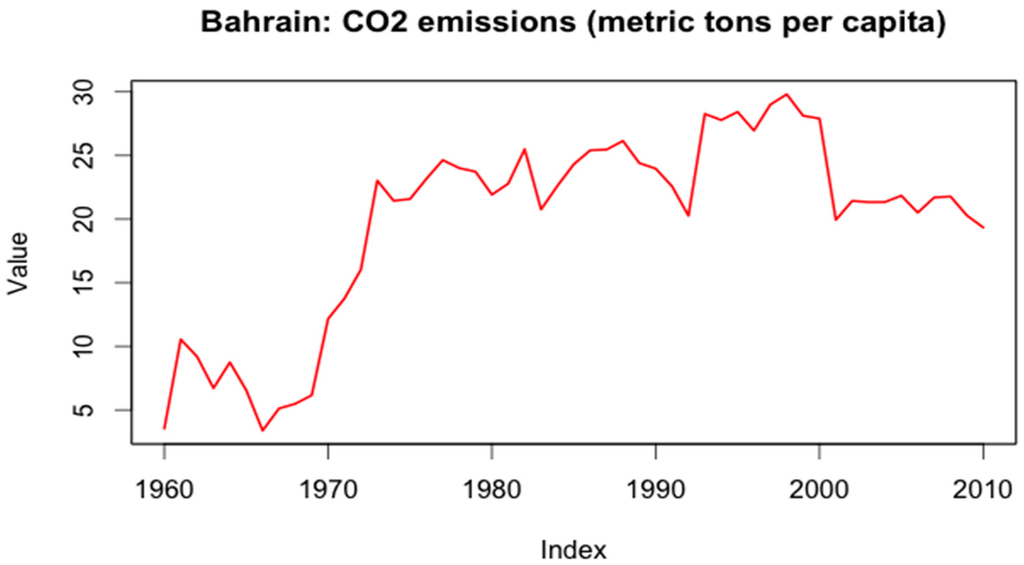 This study uses annual data on total carbon dioxide emissions for Bahrain measured in metric tons per capita for the period 31 December 1960–31 December 2011. The source of data is the World Bank database (Data link at: http://data.worldbank.org/indicator/EN.ATM.CO2E.PC?locations=BH) []. The data up until 1993 (approximately 2/3 of observations) is used as in-sample for training and validation, whilst the period covering 1994–2011 (1/3 of observations) is set aside for testing the out-of-sample forecasting accuracy of the various models. As the second period for the Kyoto protocol specifies the year 2020 as the deadline for carbon emissions reduction, our estimations are concerned with providing h = 10 steps ahead forecasts, thus including the protocol’s deadline in the forecasting horizon.