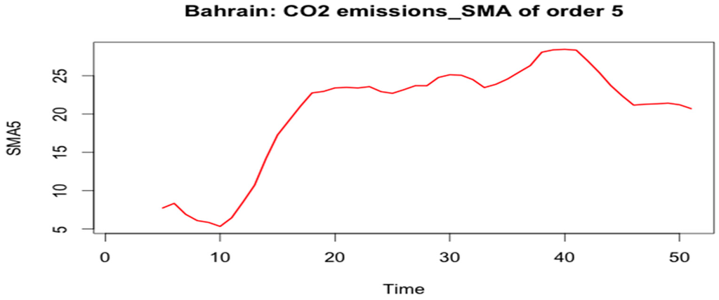 The data smoothed with a simple moving average of order 5 shows that total carbon dioxide emissions for Bahrain measured in metric tons per capita increased from the level of 3.54 at the end of 1960 to a maximum level of 29.80 in 1998, and then decreased afterwards to about 20 at the end of 2001, reaching the level of 19.34 by the end of the analysis period. In addition, the decreasing trend started again with the global financial crisis, confirming the positive relationship between the economic growth and CO2 emissions attested in the academic literature.