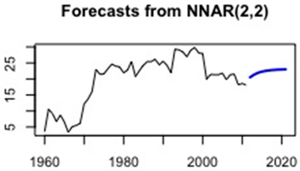 Figure 4 reflects the predictions made by NNAR for 2012–2021 as a blue line. The reversal of the decreasing trend is again obvious.