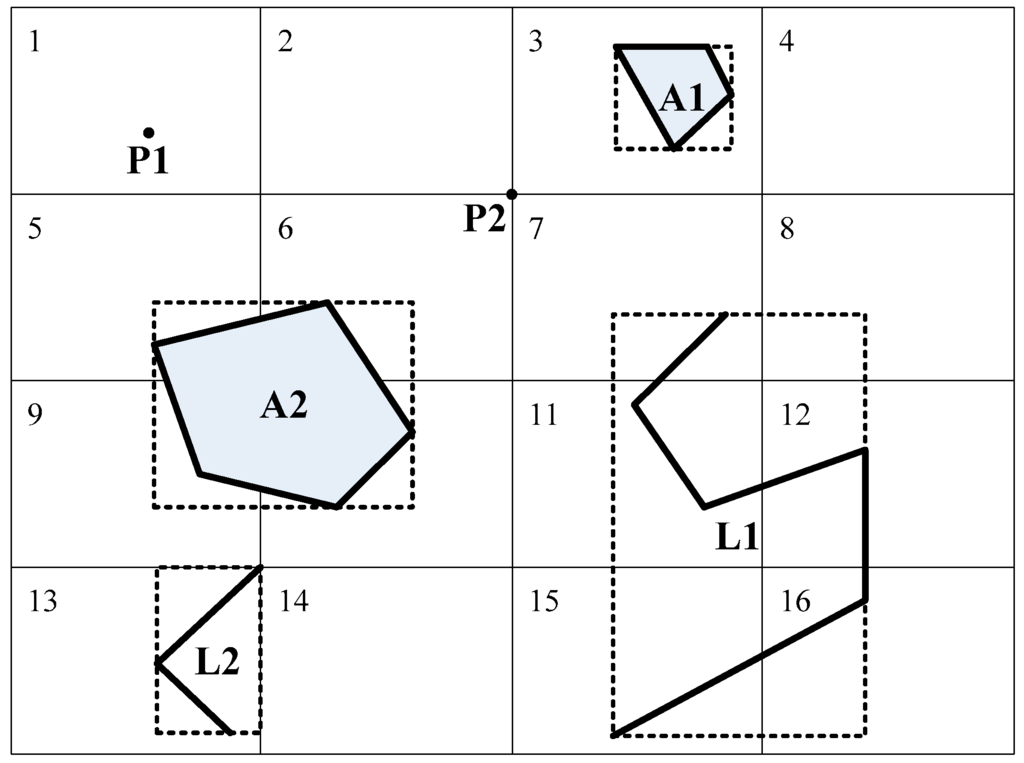 The goal of spatial partitioning is to reduce the data volume such that it fits in the memory and to perform coarse-grained parallel computing (bulk computing). As shown in Figure 1, Grid Tiles 1–16 represent the uniform grids. The spatial objects are partitioned into the tile overlap with their MBRs.