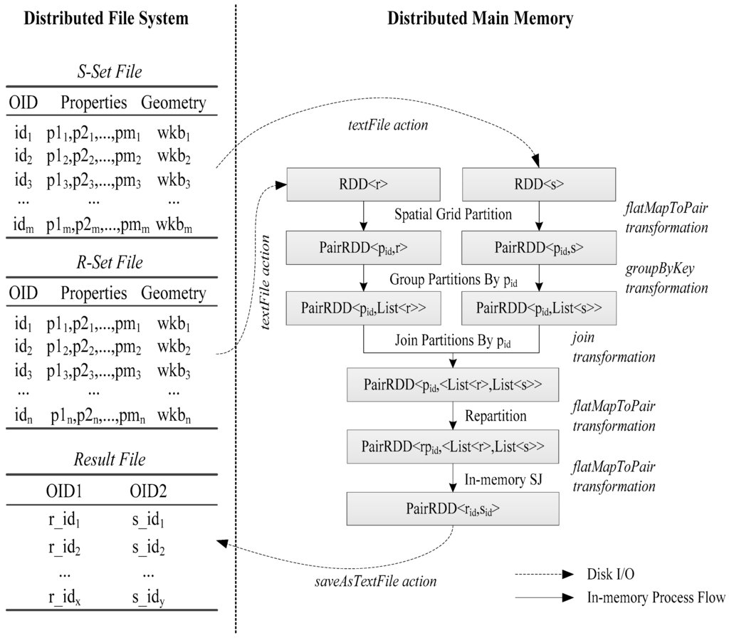 For datasets R and S stored in the distributed file system, we use the “textFile” action in Spark to read the files to RDDs cached in the distributed main memory. Then, the “flatMapToPair” transformation, indicated in Algorithm 1, is used to perform the spatial partitioning. Each flatMap calculates the grid tiles that overlap with their MBR. Then, the spatial partitioning phase returns the pairs of partition ID and geometry of each spatial object.