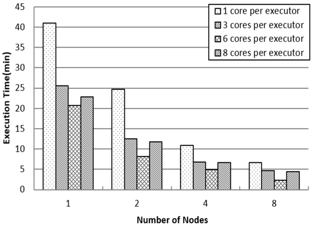 Figure 5 shows the impact of the number of nodes and executor cores on SJS performance. There is a direct relationship between SJS performance and the number of nodes. When the number of executors per node is fixed at one, SJS performance improves significantly with an increase in the number of nodes. Thus, in this case, SJS shows high scalability. However, with an increase in the number of cores per executor, the execution time of SJS may not always decrease. For instance, notwithstanding the number of nodes, the execution time for eight cores per executor is significantly greater than that for six cores per executor. Hence, when the number of executors equals the number of nodes (each node runs one executor) and the cores per executor is set to six, which is equal to the CPU cores of each node, SJS performs the best. As the number of cores per executor increases, the number of tasks scheduled on a CPU also increases, thus leading to poor performance.