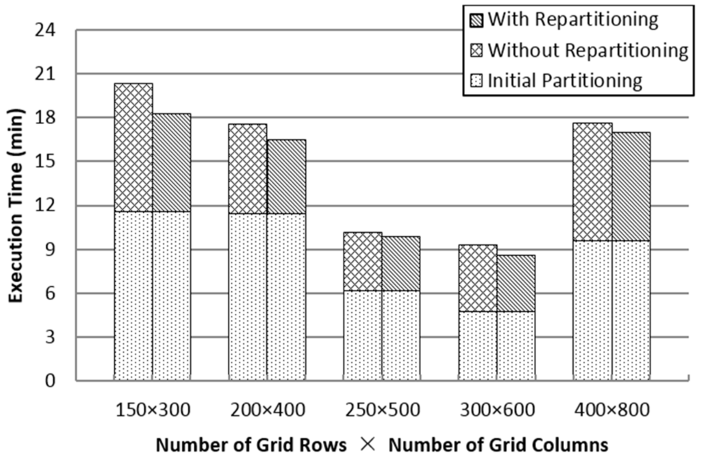 As shown in Figure 6, when the number of partitions is small, there is a large amount of data in each partition, which can trigger memory overflow or larger computation time. Furthermore, as the number of partitions increases, an excessive number of duplicates can lead to unnecessary calculation. Repartitioning can refine the data size and limit the processing time of each partition to support the in-memory spatial join in a better manner. Notwithstanding the number of partitions, SJS with repartitioning can reduce total execution time by 5%–25%, without considering the initial partitioning.