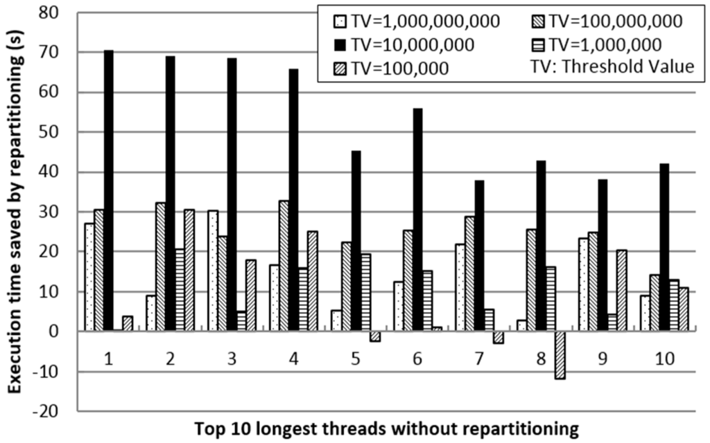 Figure 7 shows the impact of the threshold value in repartitioning on saved execution time. The negative value means the time is wasted by repartitioning; negative contributes to improve the performance. First, we sort the execution time of the processing threads (each partition is processed in one thread) of SJS without repartitioning in every node to obtain a list of the top 10 longest threads. Then, we vary TV from 100,000–1,000,000,000 in order to compare the time saved by repartitioning for each corresponding thread. From the results, we can observe that when TV is 10,000,000, significant time is saved by repartitioning. Thus, as TV decreases, the number of duplicates increases. However, as TV increases, partition refinement decreases. Hence, by efficiently reducing the execution time of the longest threads of SJS without repartitioning, in-memory repartitioning improves the performance of SJS significantly.