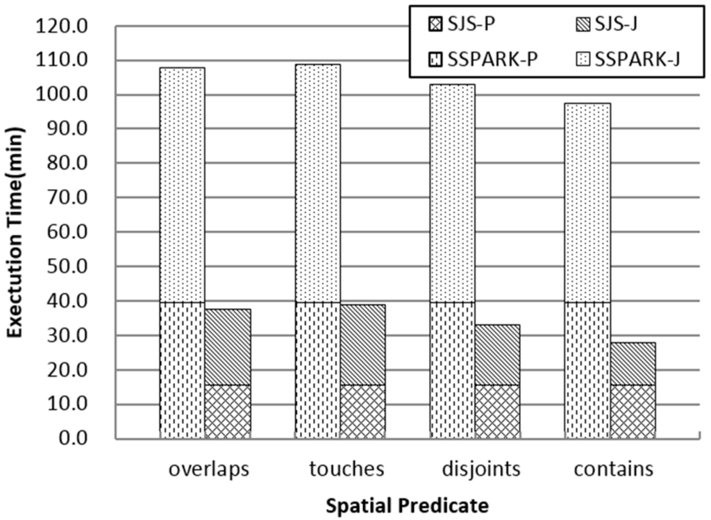 As shown in Figure 9, because SJS uses grid partition, which is more efficient than SATO in SSPARK, the execution time in the partition and partition join phase of SJS is significantly reduced. Given that (1) the repartition phase in SJS limits the processing time of each partition, which is suitable for the task schedule strategy of Spark; (2) the duplicates are avoided before refinement; and (3) the R*-tree local join algorithm in SJS outperforms R-tree nested-loop join in SpatialSpark, SJS performs better than SpatialSpark. Figure 9 also shows that both SpatialSpark and SJS support various topological analyses on large spatial datasets, and different spatial predicates obviously affect the final performance.
